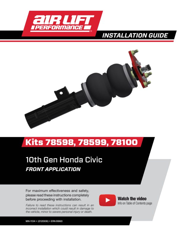 The 10th Generation Honda Civic is a staple on the road and an all-around stellar daily driver. But that won't stop you from making it the coolest ride it can be. With an air suspension from Air Lift Performance, you can get the slammed look you want, while maintaining all the versatility you need. We started by giving your Civic the maximum drop without sacrificing performance, getting you down 125mm (4.9in) from stock. But getting you low is not enough. Our kits are also about achieving the versatility that the common coilover cannot, eliminating classic lowered-car problems, like bottoming out, with the touch of a button. We pride ourselves on making sure that every Civic kit that we build not only provides a great ride, but also handles the curves like it should. In front, the 10th Gen Civic kit features double-bellow air springs over monotube, threaded-body struts, which provide a comfortable ride and great body support during cornering or braking. With 30 levels of damping adjustability, the struts allow for customization, with the ability to go from super soft up to a stiff performance setup. The struts are then topped off with adjustable camber plates that use high quality spherical bearings for precise steering feel and superior damper actuation, made of T6061 red-anodized aluminum. These plates allow for you to dial in up to three degrees of negative camber for perfect wheel fitment or optimized handling. The kit also features black powder-coated, pass-through lower mounts, providing increased suspension travel and further drop capabilities. Air Lift Company and its Performance division is committed to delivering quality parts that last. To ensure the highest quality, longevity, and customer satisfaction, the key suspension components have all been torture-tested to 1 million cycles on our in-house hydraulic test rig at temperatures ranging from -30F to 150F. With a one-year, unlimited-mileage warrant you can purchase this kit with peace of mind.