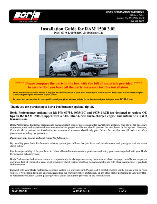 Tip Kit '25-'26 RAM 1500 3.0L 6 Cyl. (EXC. H.O. & GT Pkg.) AT 2WD/ 4WD 4 Dr Ext. Cab W/Std. Bed (6' 4") 140.5" WB/ Crew Cab W/Short Bed (5' 7") 144.5" WB/ Crew Cab W/Std Bed (6' 4") 153.5" WB. Tips NOT Incl. Reuse O.E. Tips Or BORLA® Tips.