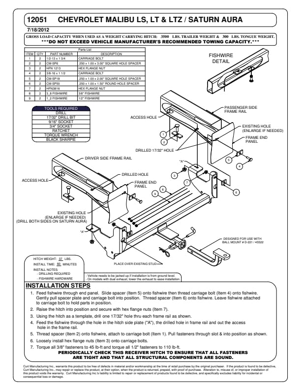 A CURT trailer hitch is the key to pursuing your passions, whether you're taking the family boat out for an afternoon on the water or packing up the mountain bikes for a day on the trails. This CURT class 2 hitch is perfect for towing a small trailer, such as a boat trailer, lightweight camper or utility trailer. It can also be used to mount a hitch cargo carrier or bike rack (never exceed the lowest-rated towing component). Like all CURT custom hitches, this class 2 trailer hitch is made for a vehicle-specific fit. It is engineered to seamlessly integrate with select years of the Chevrolet Malibu and Saturn Aura (see application info to verify fitment). It is rated for 3,500 pounds gross trailer weight and 300 pounds tongue weight. It is also equipped with 1-1/4" x 1-1/4" hitch receiver to accept the included ball mount. The ball mount that comes with this hitch kit has a 3/4" trailer ball hole and can be positioned in the drop or rise orientation for level towing with your specific trailer (trailer ball not included). Like all CURT custom receiver hitches, this class 2 hitch is designed, manufactured, finished and tested with the utmost care. It is engineered for a precise fit, easy installation, maximum towing strength and an integrated look on the vehicle. It is also tested to SAE J684 protocols for safety. This class 2 trailer hitch is finished with our industry-leading dual-coat process for unparalleled rust, chip and UV resistance. It is descaled for a smooth surface, submersed in liquid A-coat for rust prevention inside and out, covered with a highly durable powder coat, and finally co-cured for a dependable shield against the elements. This class 2 hitch comes with a ball mount, hitch pin and mounting hardware for a complete installation.