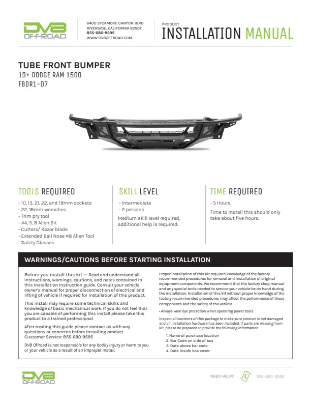 2019-2025 Ram 1500 Tube Front Bumper designed for high-clearance off-road use. Center section fits a 20" dual-row light bar with (2) 3" pods or (6) 3" pods. Wings hold (2) 3" pods per side. Optional prerunner-style push bar mounts a 20" light bar, (4) 7" rounds, or (8) 3" pods. Includes full skid plate for added protection. Retains factory parking sensors. Features welded zip-tie tabs for wire management, micro-texture black powder coat, and speckled steel gray accent panels. Bolt-on installation.