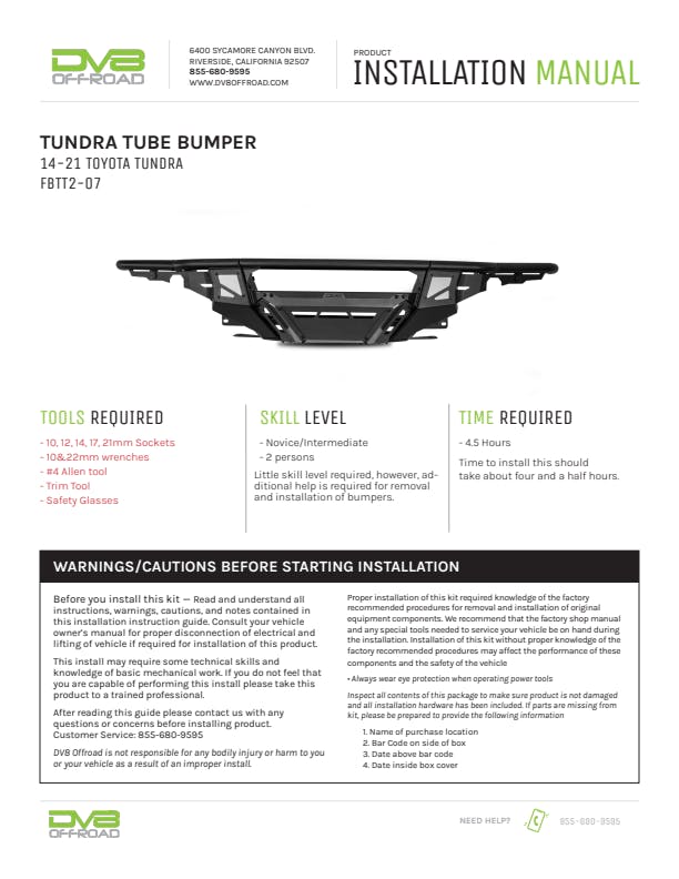 The Tube Front Bumper for the Toyota Tundra is built for both high-speed desert use and slow-speed rock crawling. It supports a 20" dual-row light bar or up to six 3" pods in the center, plus one 3" pod per side. The optional prerunner-style push bar can mount a 20" bar, four 7" round lights, or eight 3" pods. A speckled gray full skid plate provides added front-end protection. The bumper retains factory parking sensors & tow points, includes welded zip-tie tabs for clean wiring, and installs with a bolt-on process. Finished in micro-texture black powder coat.