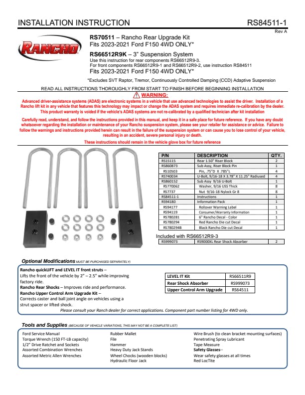 - Rancho product warranty is voided if the vehicle’s ADAS systems are not re-calibrated by a qualified technician after kit installation