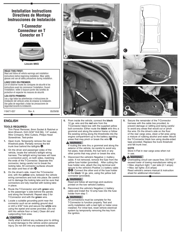 T-One Connectors require no splicing of vehicle wires. Simply locate your vehicles wiring harness connector, unplug the connection and insert the T-One Connector into the vehicle's harness. No special tools required. Factory appearanceQuick and easy installationSolid, weatherproof, one-piece constructionNo cutting, splicing or taping of vehicle wiresIncludes converter where needed16 gauge bonded wire with 4-Flat plug & capStop/Turn circuit capacity of 4.2 AmpsTaillight circuit capacity of 7.5 Amps1 year limited warrantyStop/Turn circuit capacity of 2.1 Amps